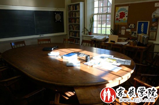 埃克塞特学院每一间教室都有一张醒目的“哈克尼斯”椭圆形木桌。上课时,学生和老师围坐在大桌子旁交流讨论。